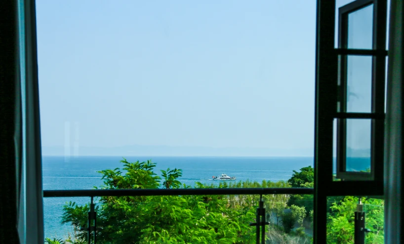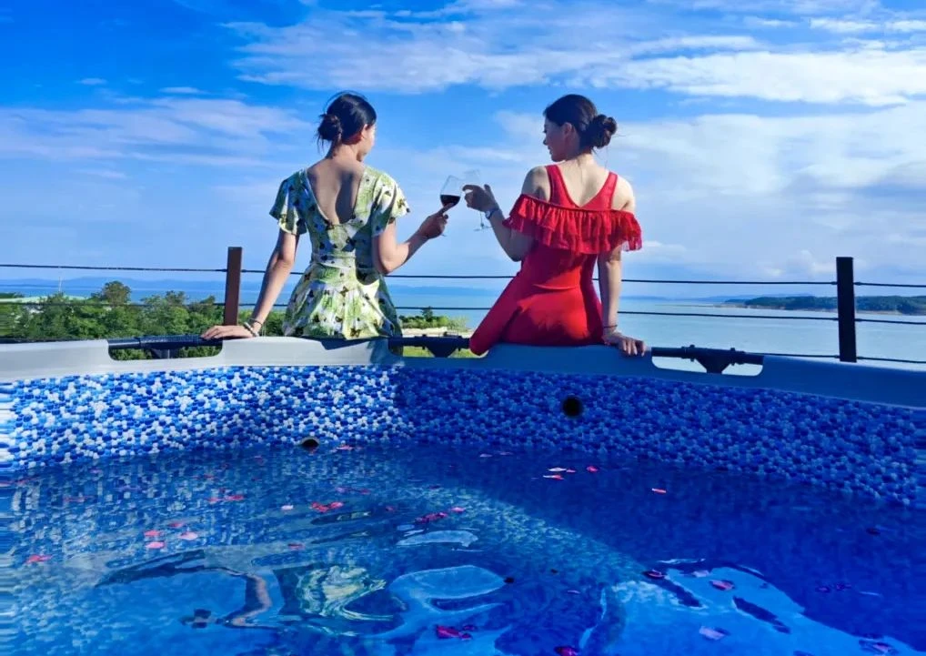 原木与山林巧妙融合,自然、低调而不失质感,大至家居,小至摆件,都无一不透露着典雅的艺术气息。有时,在某个不经意的转角,偶遇绿植与光影作画的惊喜。而其中,最令人惊喜的是窗外万顷的蔚蓝,与户外树木相映成趣。坐在露台上,看阳光云朵,映照江面泛起琥珀色光晕。