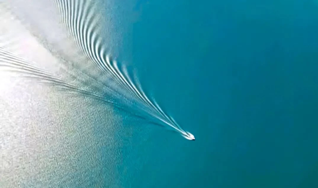 一条条疾驰的游轮拖拽着长长的波浪