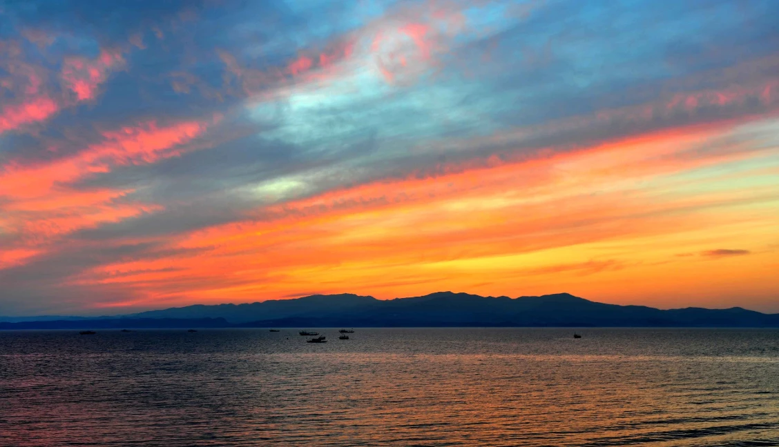 连飞过的水鸟都披上了霞光