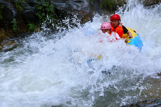 全长6公里,整体落差210米,有三处穿山岩洞,一处回旋型漂流河道,纵横峡谷,飞跃瀑布,单个最高落差45米,形成了以‘岩洞漂、暗河漂、瀑布漂、峡谷漂、回旋漂’五大漂流特色。每一段漂流都是一个里程碑,每一次颠簸都是一场历险记,有惊无险,激情飞扬。